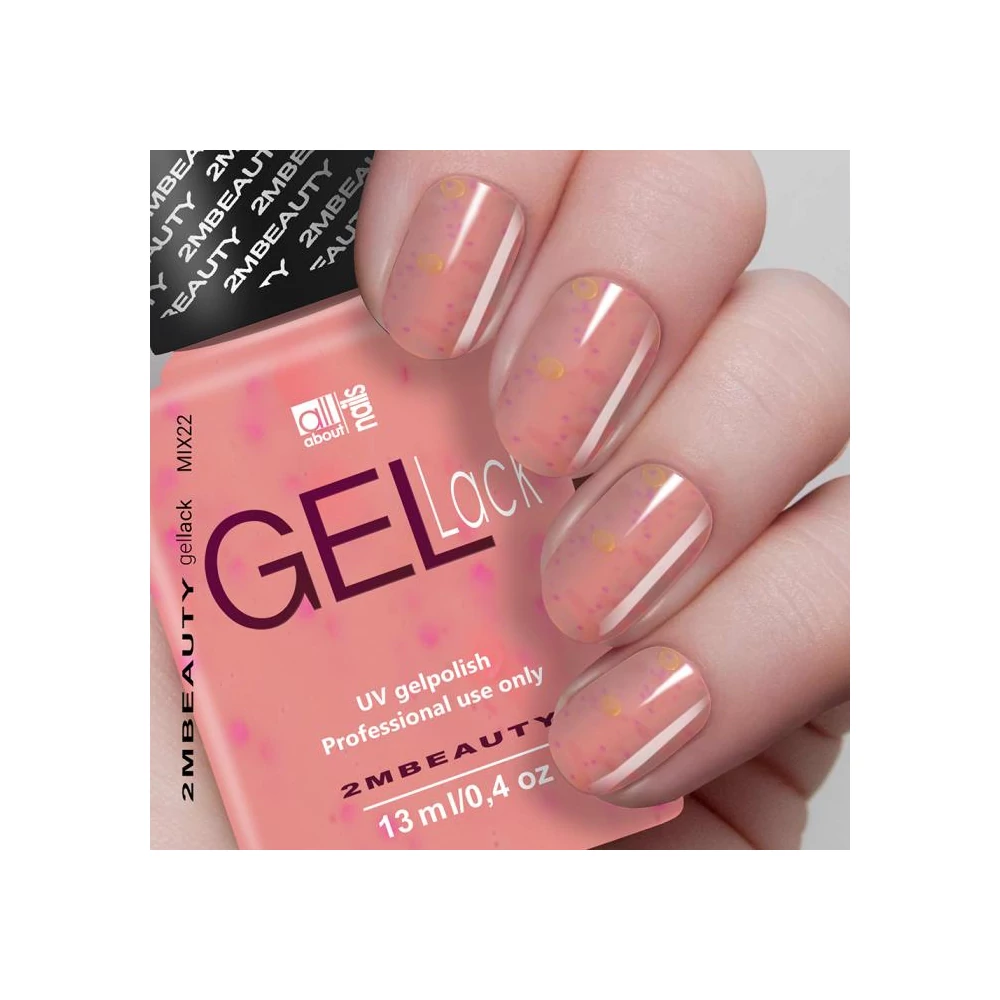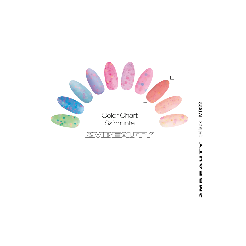 Rózsaszín alapon különböző méretű csillámos és flitteres gel lack, amellyel könnyedén feldobhatjuk az egyszerű színeket.